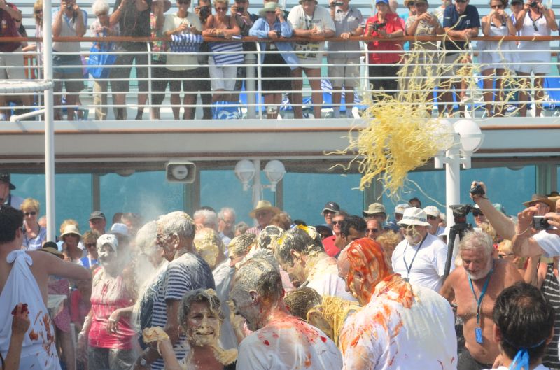 Pollywogs we are not, as we have crossed the Equator before; however we did go to the Crossing of the Equator ceremony to see King Neptune passing sentence on the ‘’accused”. They were then suitably covered in flour and pasta by the staff and one unlucky passenger was ‘’operated’’ on behind towels to remove his ‘’funny bone’’.