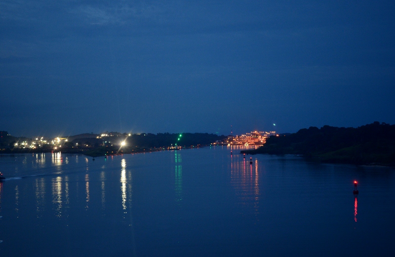 We saw dense tropical forests along the way, and sometimes the land was so close to the ship that we could hear the birds in the trees. The ship’s lecturer commentated all along the way, giving us many interesting facts about the history of the Panama Canal and also telling us about the monkeys, sloths and birdlife that live in the forests. I saw a small crocodile sunning itself on a bank not far from the ship, and although I managed to get a quick photo, it is hard to see it against the mud bank. I also noticed that the grass had been mown all along the sides of the canal, and found out that it isn’t done just to make it look neat, but rather to discourage snakes from coming too close to the canal.