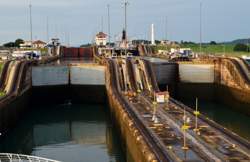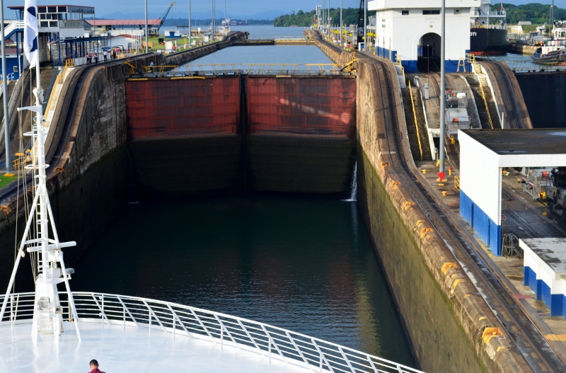 As we approached the first lock, electric locomotives known as “mules “attached themselves to the ship with steel cables and manoeuvred the ship into a central position whilst the gate closed behind us. The water used to raise and lower the vessels in each set of locks is obtained from Gatun Lake by gravity and poured into the locks through a main culvert system that extends under the locks chambers from the sidewalls and the centre wall. It seemed only a matter of minutes before the ship was at the correct level then the gates opened, the cables were released and the captain steered the ship to the next lock.