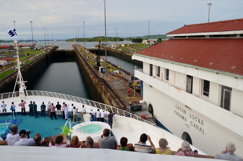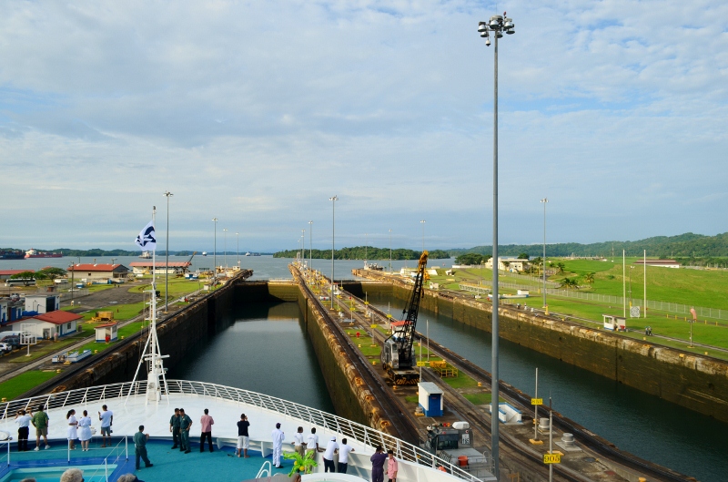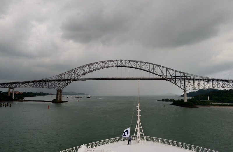This morning we were awake early and saw many vessels at anchor, waiting for passage through the canal. At 5.15am the pilot came onboard and we were pleased to find out that passenger ships get priority, so we had a smooth run right through, although it did take about 9-1/2 hours from the first lock to the Bridge of the Americas.