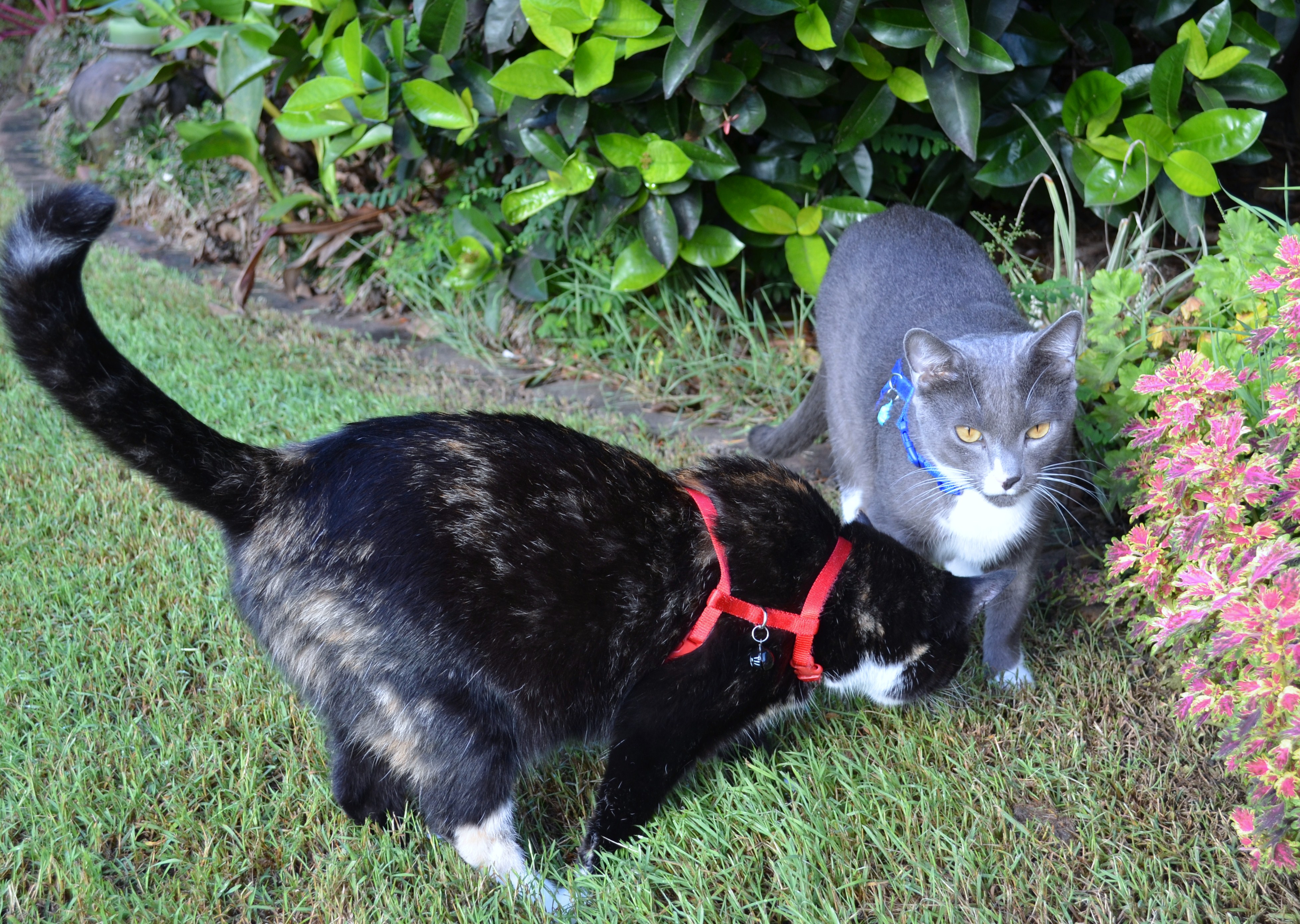 Should cats be confined indoors? That is the question we had to ask ourselves when we bought home our kittens two years ago. When I was growing up, there was always a cat in the family who spent the day outside and came home for dinner. These days being more enviromentally aware, we decided that we would keep our cats indoors. When I went to the council to register them, I was given some information regarding a cat cage which is similar to a large aviary. This seemed a good idea and we went ahead and had a cat cage installed next to our patio with a bridge from our dining room window where they can gain access. In addition to that, I bought them harnesses and started to take them out for walks around the garden with their leads on. Once they got used to that, I detached the leads and now they go out (with close supervision) with their harnesses on every couple of days. The first few times each one climbed over the fence, but they found out very quickly that they were immediately bought inside, so now they spend their time in the garden, I get some weeding done and they usually come in on their own after an hour or two. Not only am I keeping my cats out of harm’s way, but I am also trying to do my bit to save the bird and lizard population as well. We live on a reasonably busy street and I would be too worried to let them out alone so this seems a good balance. What do you think – have you made the decision to keep your cat indoors or do you let yours roam free?