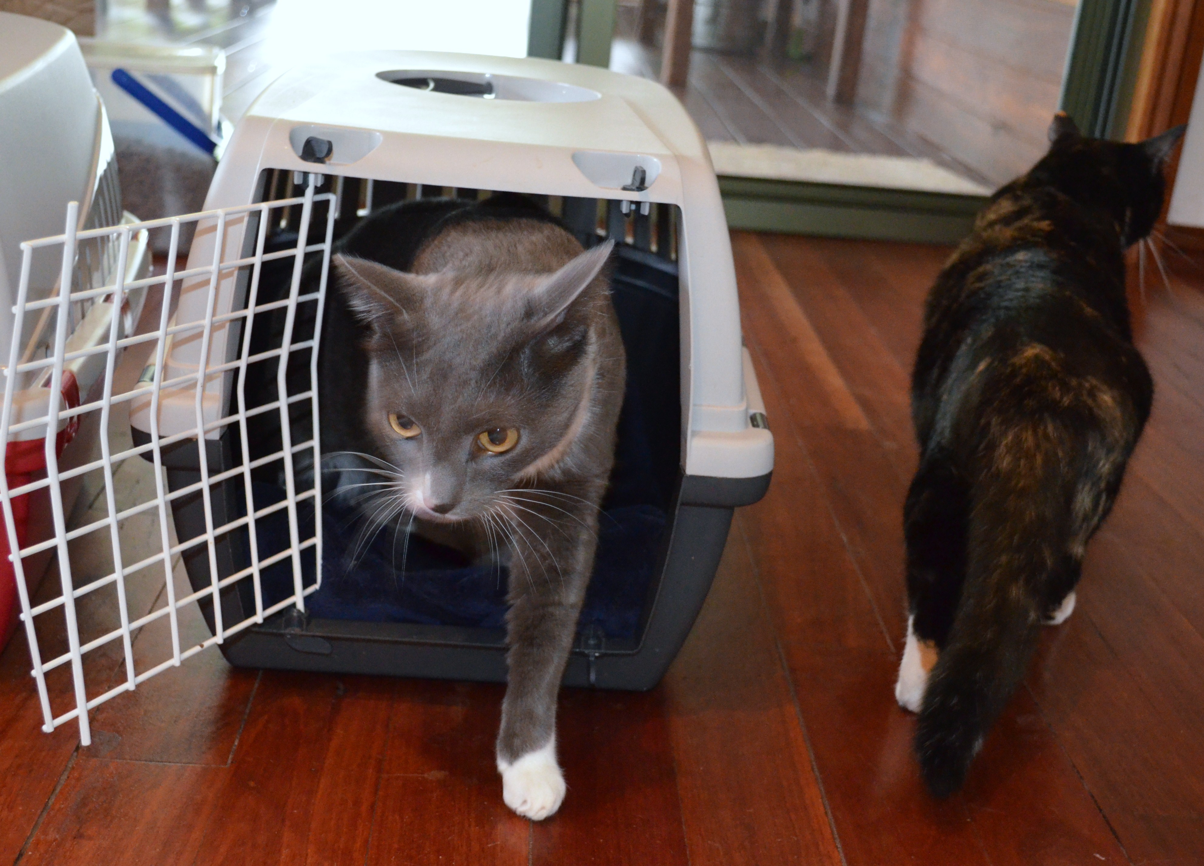 Samurai quite likes to get into his cage but Mischa needs a gentle push!