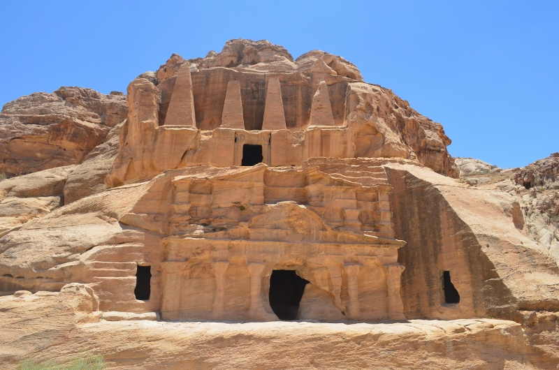 The Lost City of Petra was revealed as we made our way through the narrow rock gorge, dwarfed by towering walls. At the entrance is the remains of an arch, one of its bases is still there. There is much evidence of towers, obelisks and tombs with inscriptions built into the face of the sandstone and after walking for 2-3 kilometres, we finally emerged into a large square where The Treasury was revealed. This is an elaborate ancient sandstone building, carved into the rock face and built from top to bottom. It was featured in the film Indiana Jones and the Last Crusade. It is believed to have been built as a tomb during the first century B.C.