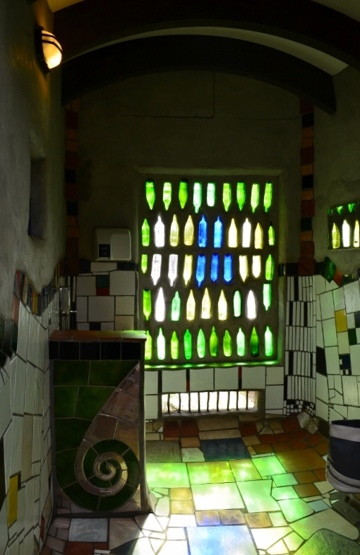 Friedensreich Hundertwasser (1928-2000) was born in Austria, and became New Zealand’s adopted son; internationally regarded architect and ecologist. He lived near Kawakawa for 25 years and was commissioned to design and build the public toilets in the town’s main street. He used local labour and talent, bricks from local buildings and the windows were constructed using old bottles from the district.